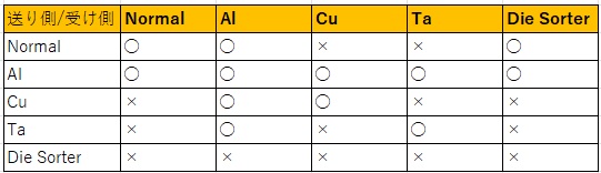 クロス表とはFOUP交換の可否を一覧化した表で、縦軸に送り側FOUP、横軸に受け側FOUPを並べ、交点に ○(交換OK) / ×(交換NG) を記載したものです。