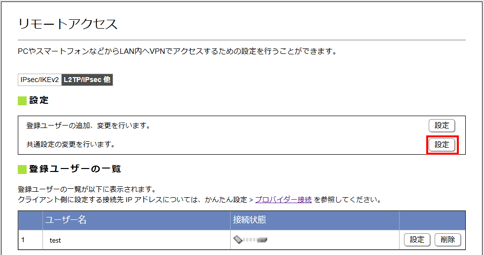 L2TP/IPsecを選択して、「登録ユーザーの追加、変更を行います。」の設定ボタンを押下します。