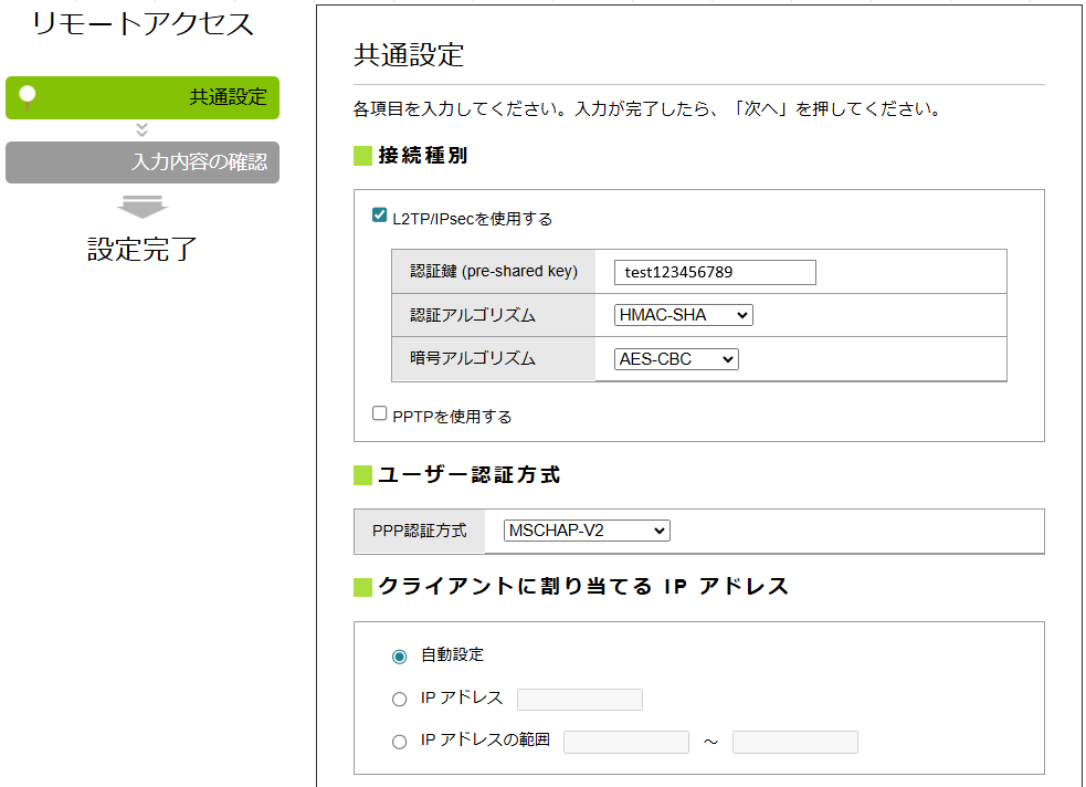 - リモートアクセス接続するPCに割り当てるIPアドレスです。お好みで。