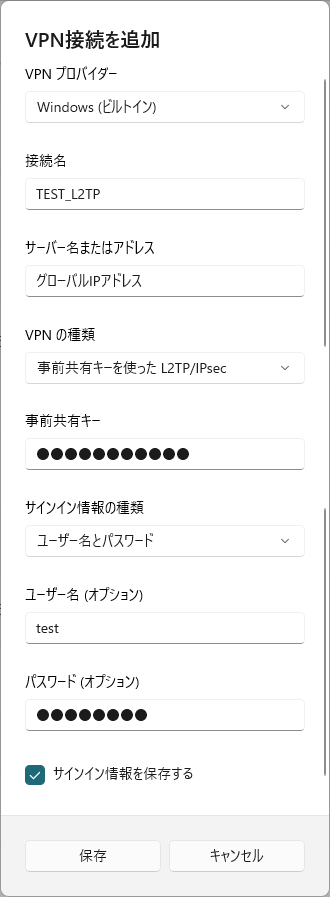- VPN種類 事前キーを使ったL2TP/IPsec