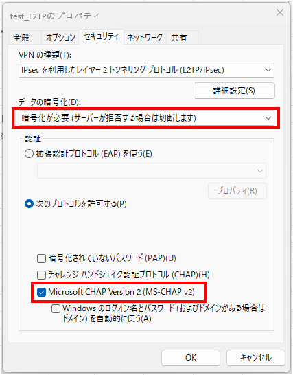 - 次のプロトコルを許可する Microsoft CHAPversion2(MS-CHAPv2)をレ点を入れる。